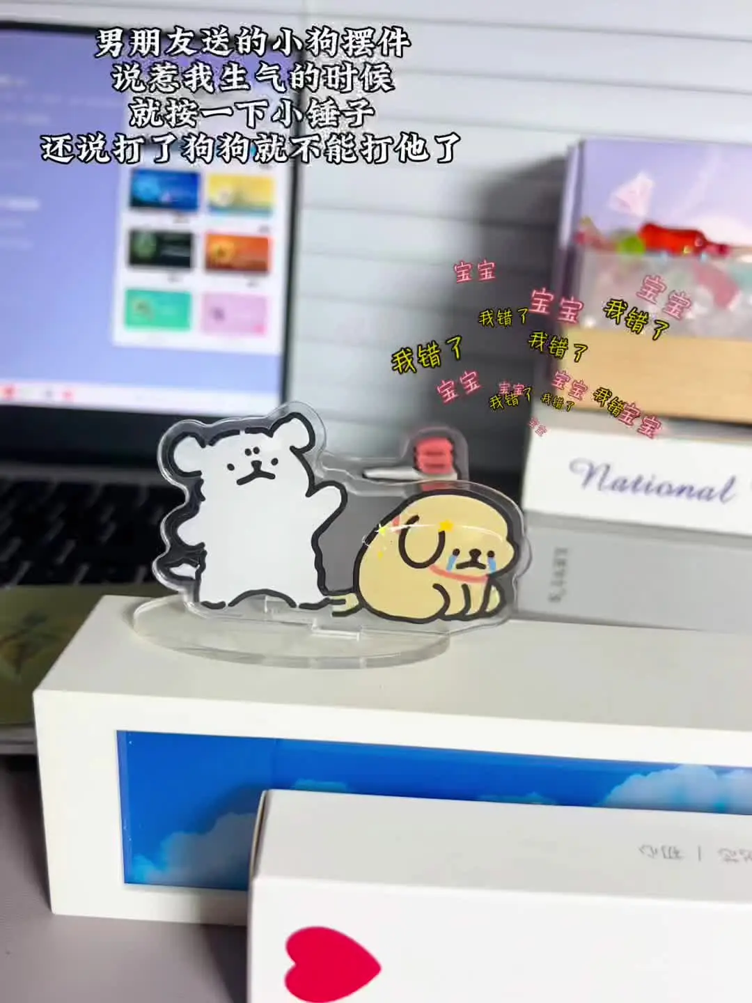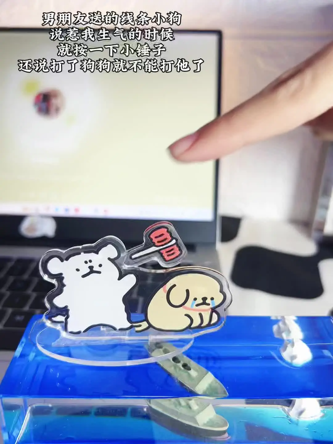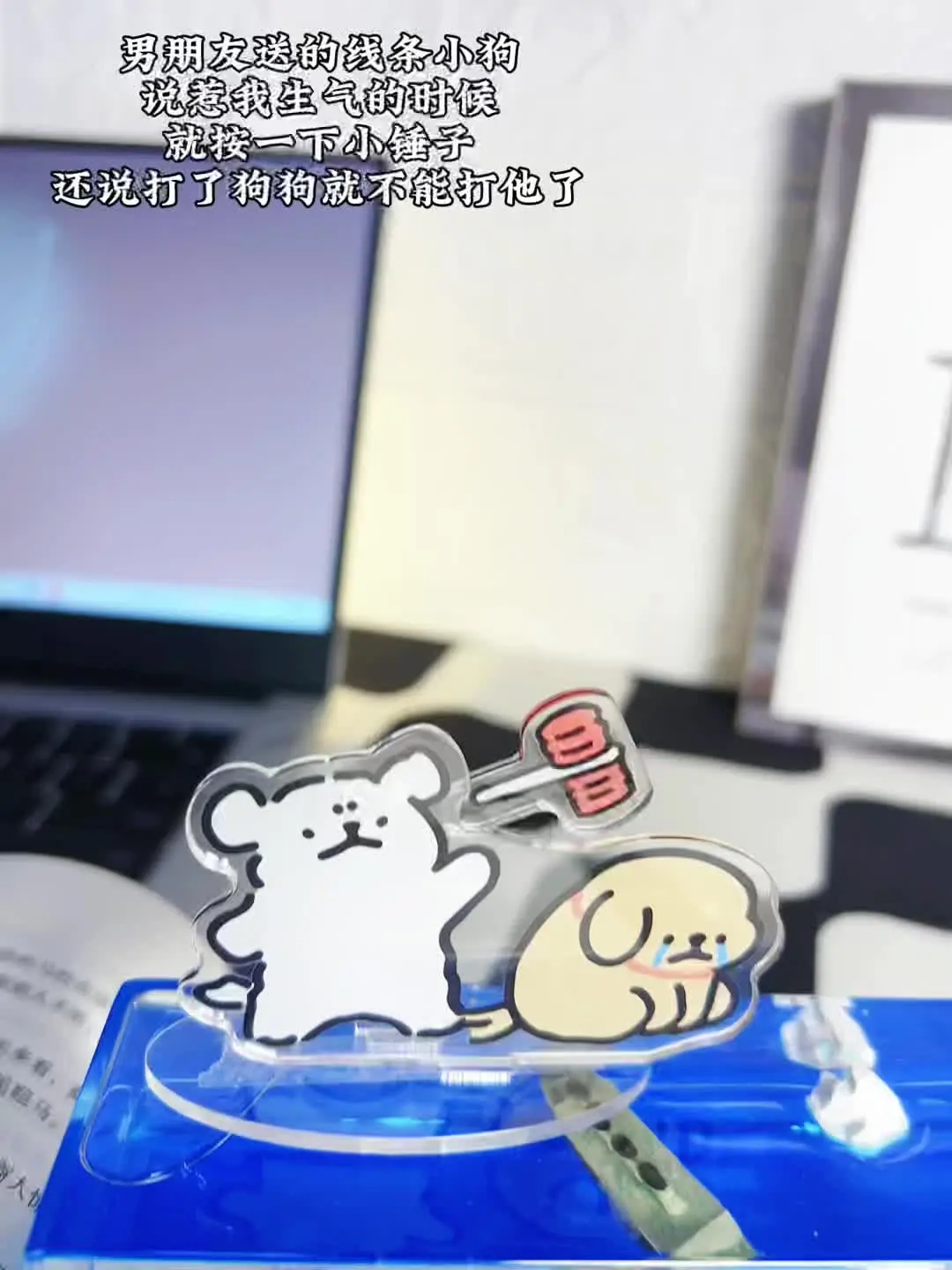 这是一则情侣日常分享,博主展示了男朋友送的线条小狗解压摆件,男友表示惹博主生气时,就按摆件上的小锤子,打了狗狗就不能打他了,满是恋爱趣味。