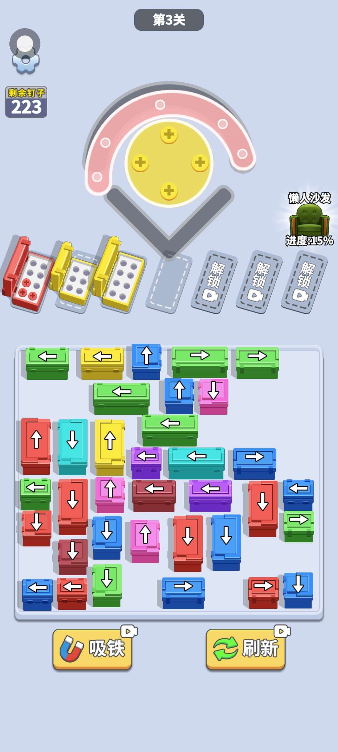 这游戏明显有BUG,难道是我看错了吗,那黄螺丝为什么消不下去,到底是显示错误还是箱子错了,放两个黄箱子螺丝一动不动