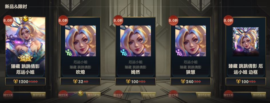 臻藏 跳跳倩影 厄运小姐今日限时上架战利品商城,首周可享8折优惠!截止至11月14日,召唤师使用橙色原石*1200即可兑换臻藏 跳跳倩影 厄运小姐。此外,还有8折优惠的皮肤边框-臻藏 跳跳倩影 厄运小姐、姿态-吹熄、精英姿态-嫣然、超级姿态-狭慧可供兑换。