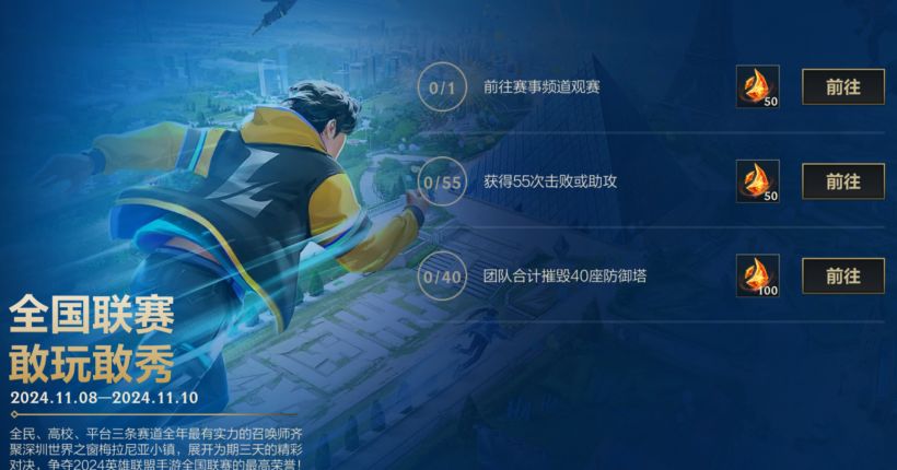全民、高校、平台三条赛道,全年最有实力的召唤师齐聚深圳世界之窗梅拉尼亚小镇,展开为期三天的精彩对决,争夺2024英雄联盟手游全国联赛的最高荣誉!即日起,截止至11月10日23:59活动期间,召唤师们完成所有任务即可获得龙魂水晶*200好礼~