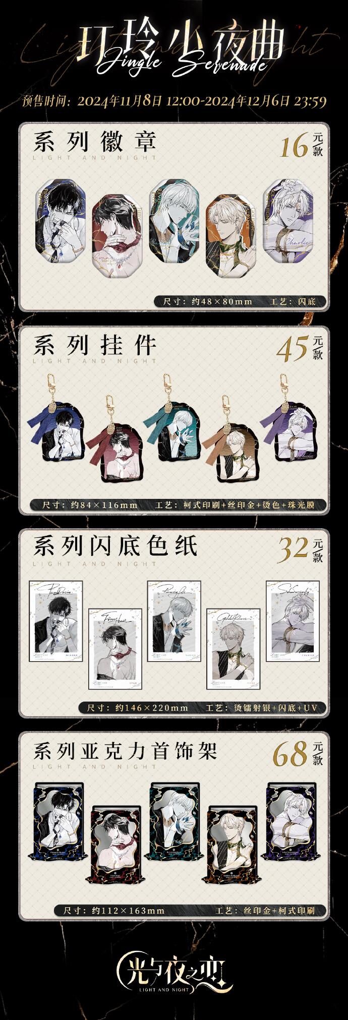 光与夜之恋猎权欲影、Q版迷你徽章组·第二弹、深陷于眸长条徽章和玎玲小夜曲系列限时周边新品,将于11月8日12:00正式开售。
