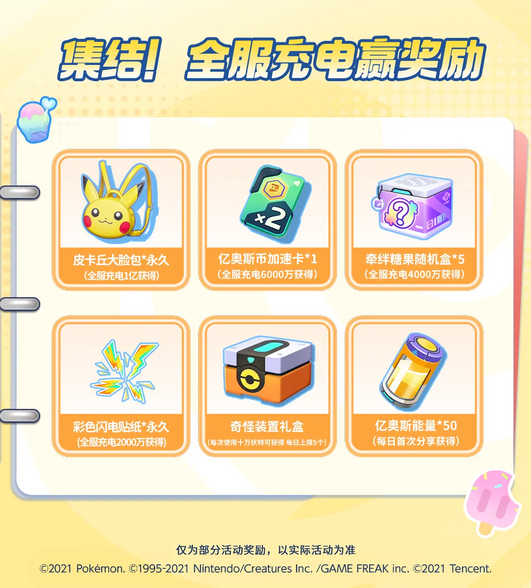 活动奖励:前往道具箱打开礼盒,可获得随机奖励,每位训练家每天最多可获得5个奇怪装置礼盒。全服训练家注入电量累积还可解锁皮卡丘大脸包、彩色闪电贴纸、亿奥斯币加速卡等惊喜奖励!