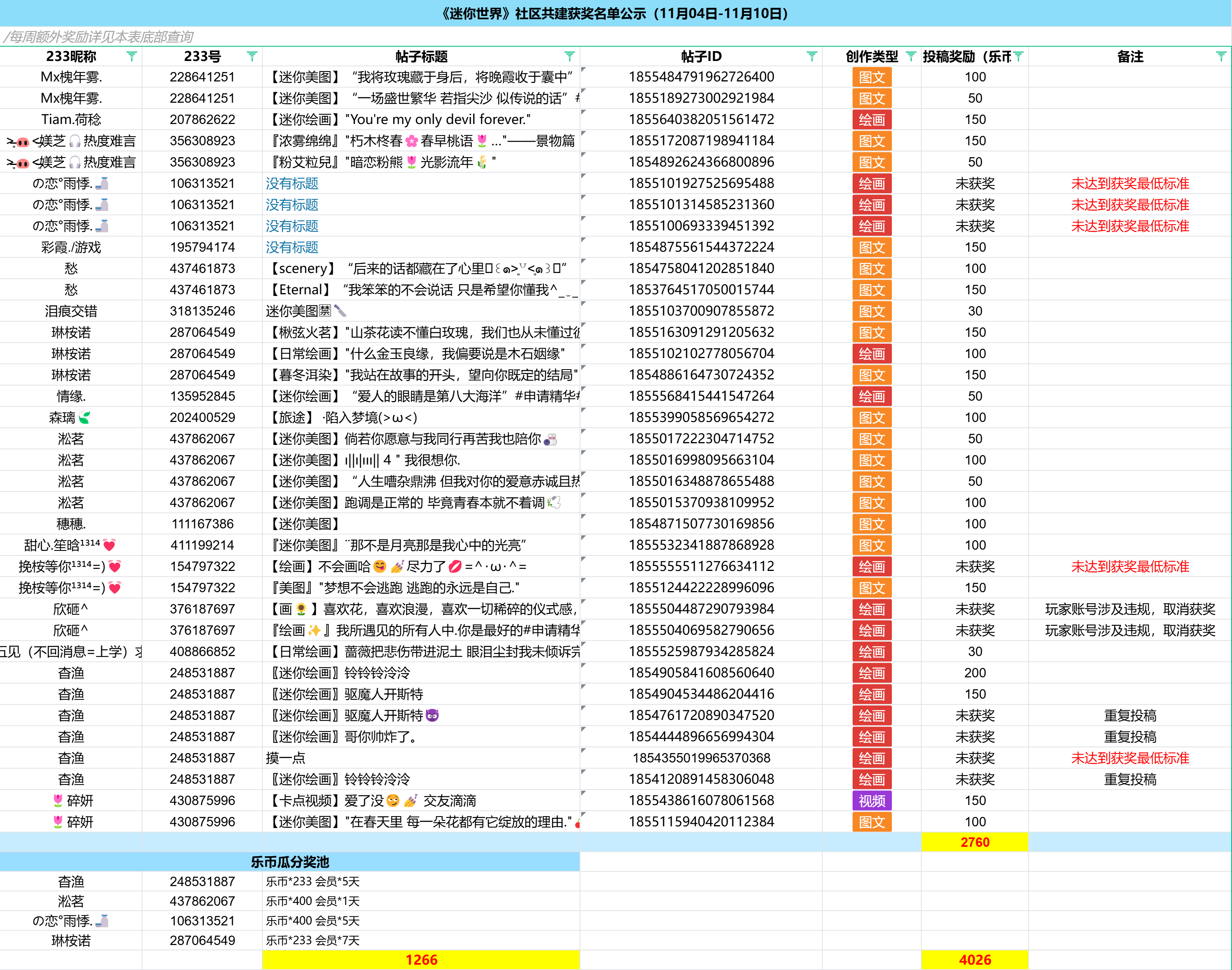 叮咚,上周获奖名单出炉啦~让我们康康都有谁获奖了吧!欢迎大家持续参与到社区共建中来,近期新上线的【分享迷你日常】话题征集活动,也可以踊跃前来投稿尝试哦!(敲30个字就有机会拿到乐币,还不快来薅羊毛啊!)#迷你世界社区共建