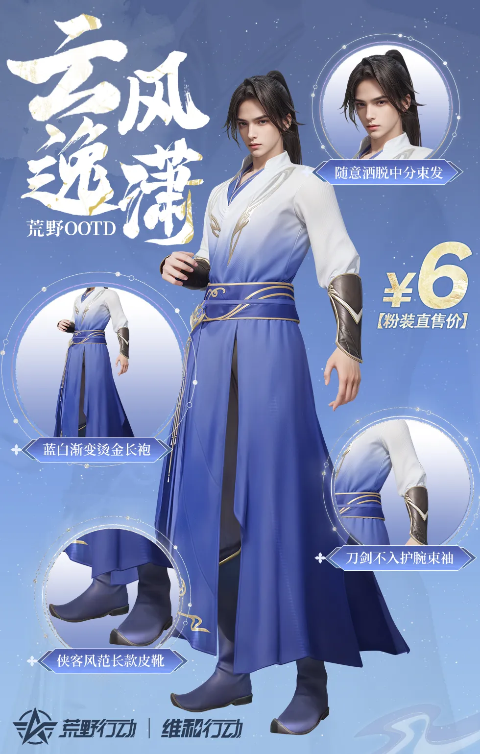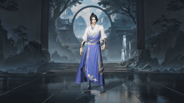 以淡雅的蓝白渐变为主色调,仿佛将天空的辽阔与自由融入其中。长袍轻盈若羽,随风轻扬,每一步都踏出了武者的飘逸与不羁。