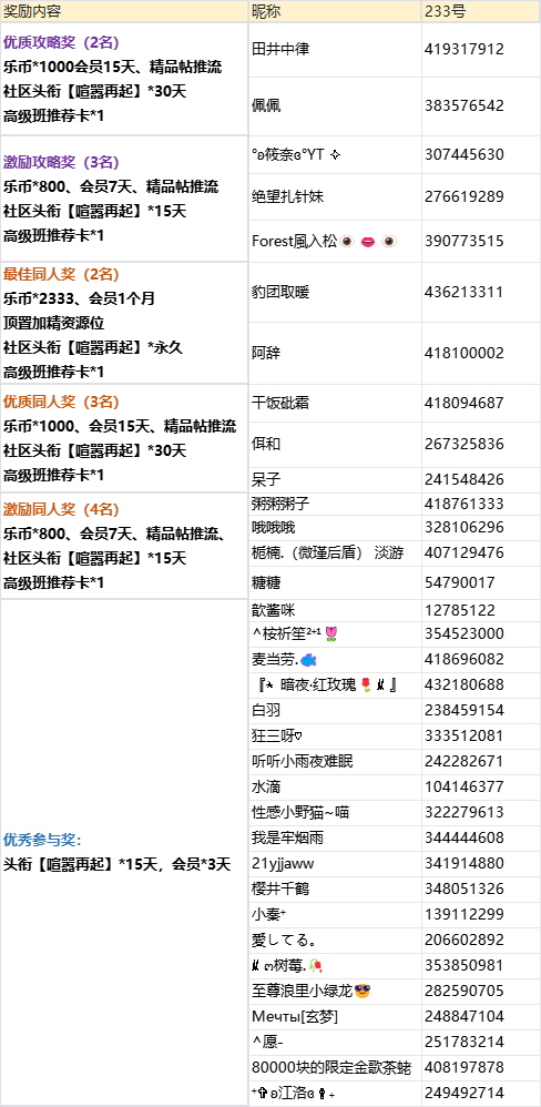 ▲最佳攻略奖(1名):乐币*2333、会员1个月、顶置加精资源位、社区头衔【喧嚣再起】*永久、高级班推荐卡*1