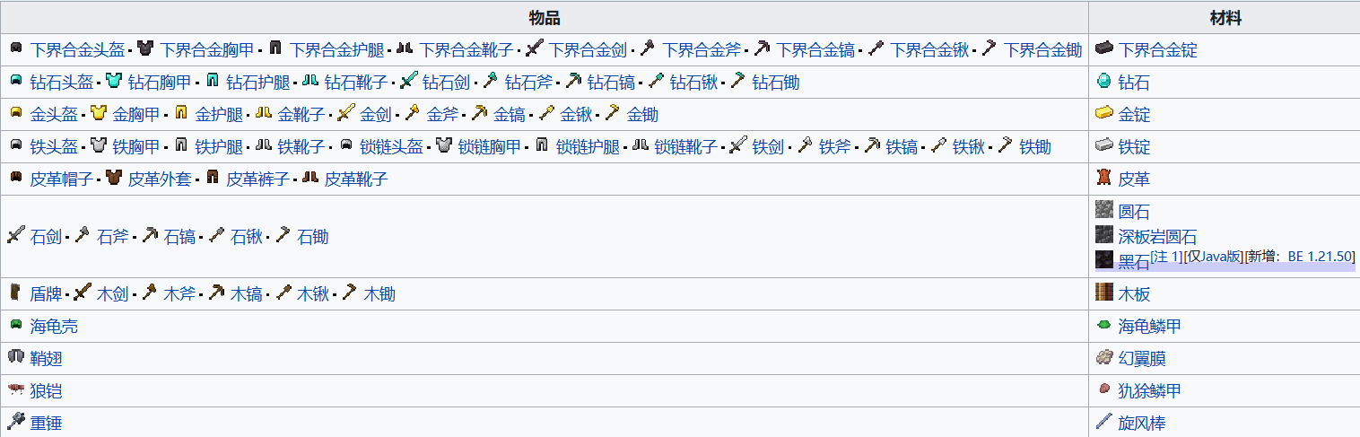 使用其合成原料来修复受损的物品。例如,可以使用铁锭修复铁质工具和盔甲。可修复物品的默认名称应具有与修复材料相对应的品质前缀;例外情况为铁锭修复链甲、幻翼膜修复鞘翅。
