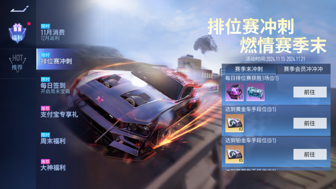 迎接新赛季,登录领好礼。11月15日~11月21日,在赛季末最后一周,车手们每日登录赛场均能解锁当日奖励,千万别忘了喊上自己的车友一起来参与活动,向着新赛季一起出发吧!