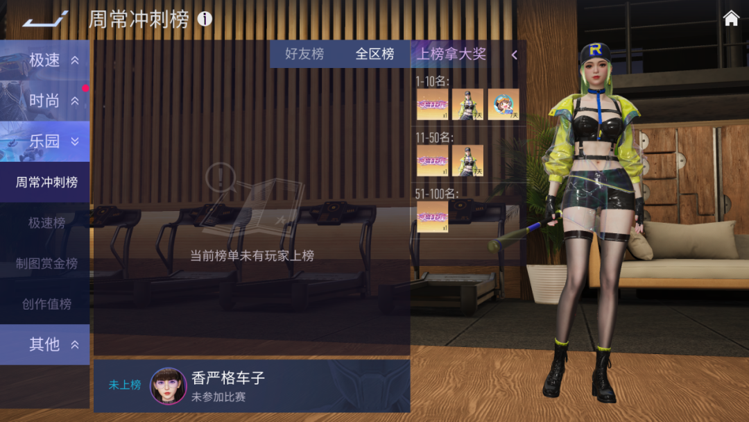 乐园新增周常冲刺榜,根据最新一期所有乐园对决地图的最快用时之和来进行全区服排名,每周五0点进行一次排行榜结算,前100名的优秀乐园车手们将获得稀有的动态头像、时装及称号奖励。此外,上榜的车手们还可以展现极具个性的时装动作(排行榜专属定制),彰显车手们别样的风格。