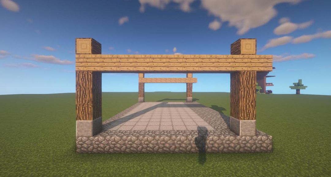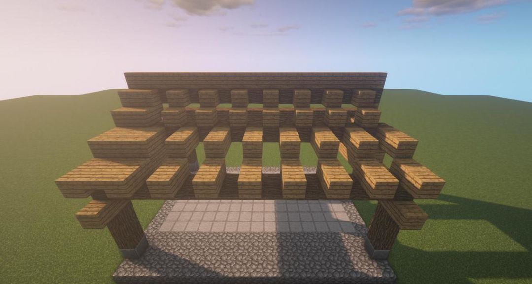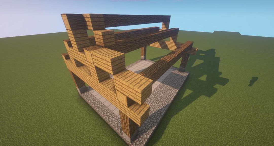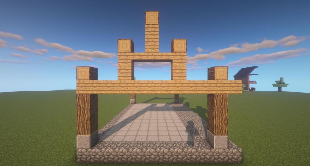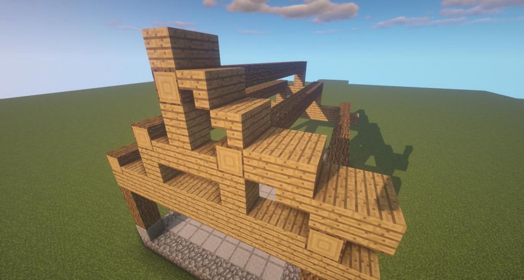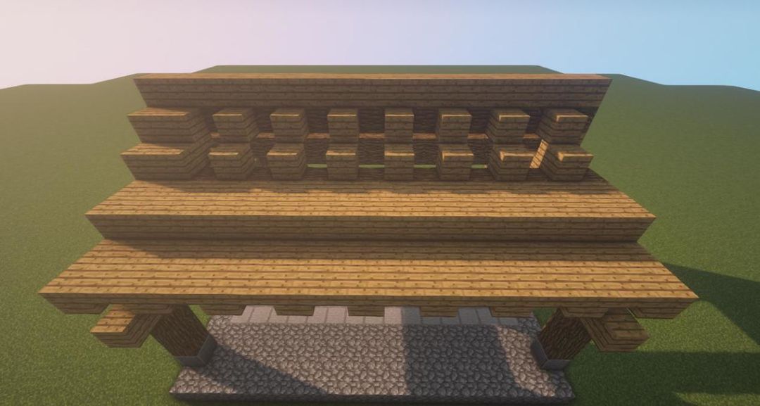 在础石上放三个橡木原木,再放上一排橡木木板,上面放一个橡木原木~