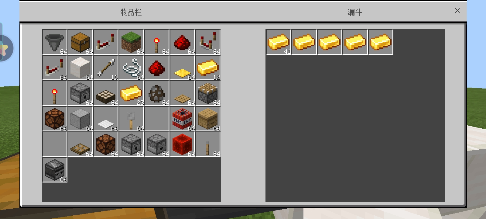 在那个旁边是红石比较器的漏斗,一个格子放置41个货币(货币到底是什么,可以调整)另外四个格子均放入一个货币(为了防止其他货币掉入),这样这里就是有45个的货币