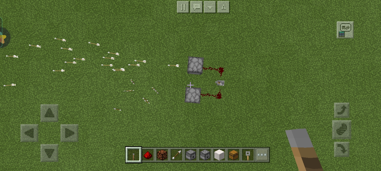 然后因为红石信号不够,就在红石那一端放红石中继器,然后铺一段红石路,连接投掷器