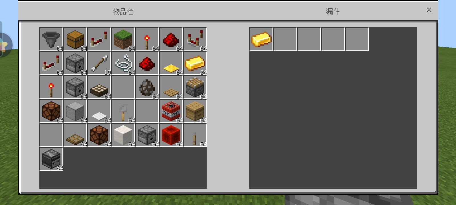 在下一个漏斗放置一个金锭(如果你是想和朋友联机自己也可以拿到抽奖需要的货币的话,就要这么干,但是如果是建造服务器的话,就不需要了,因为你根本不用在乎这些货币)