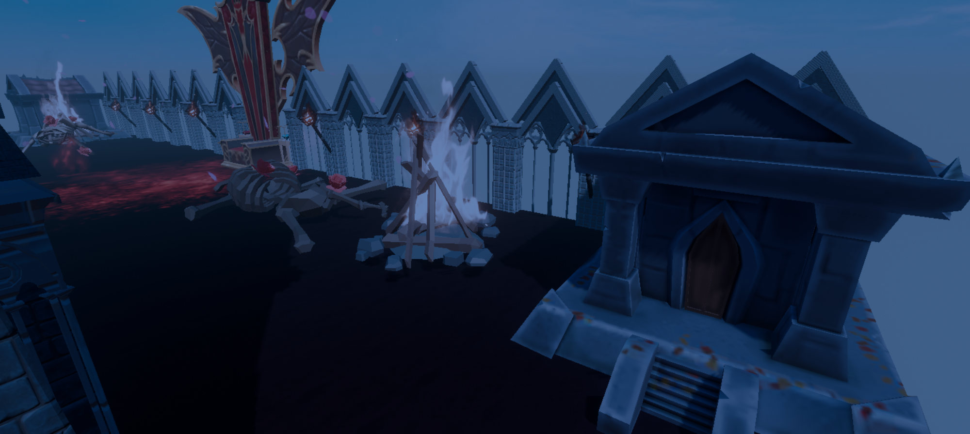 城堡后是巨大的王座以及旁边随意散落的骨头与棺材...