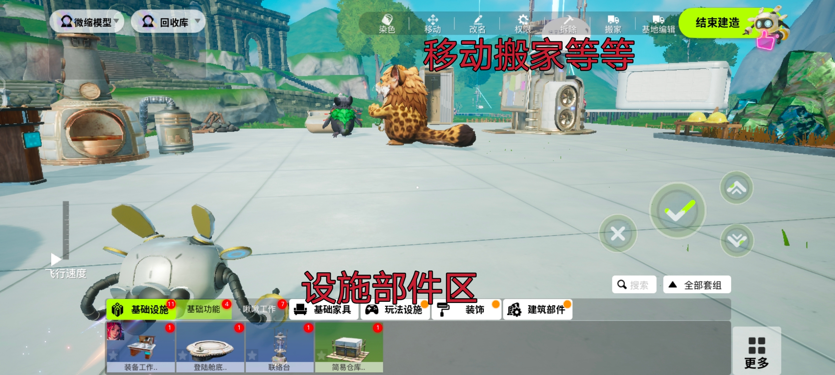 5.点击建造就可以进入建造页面,之后就可以选择设施或者部件给家园添加建造,建造界面还可以进行移动设施与部件或者搬家等等。