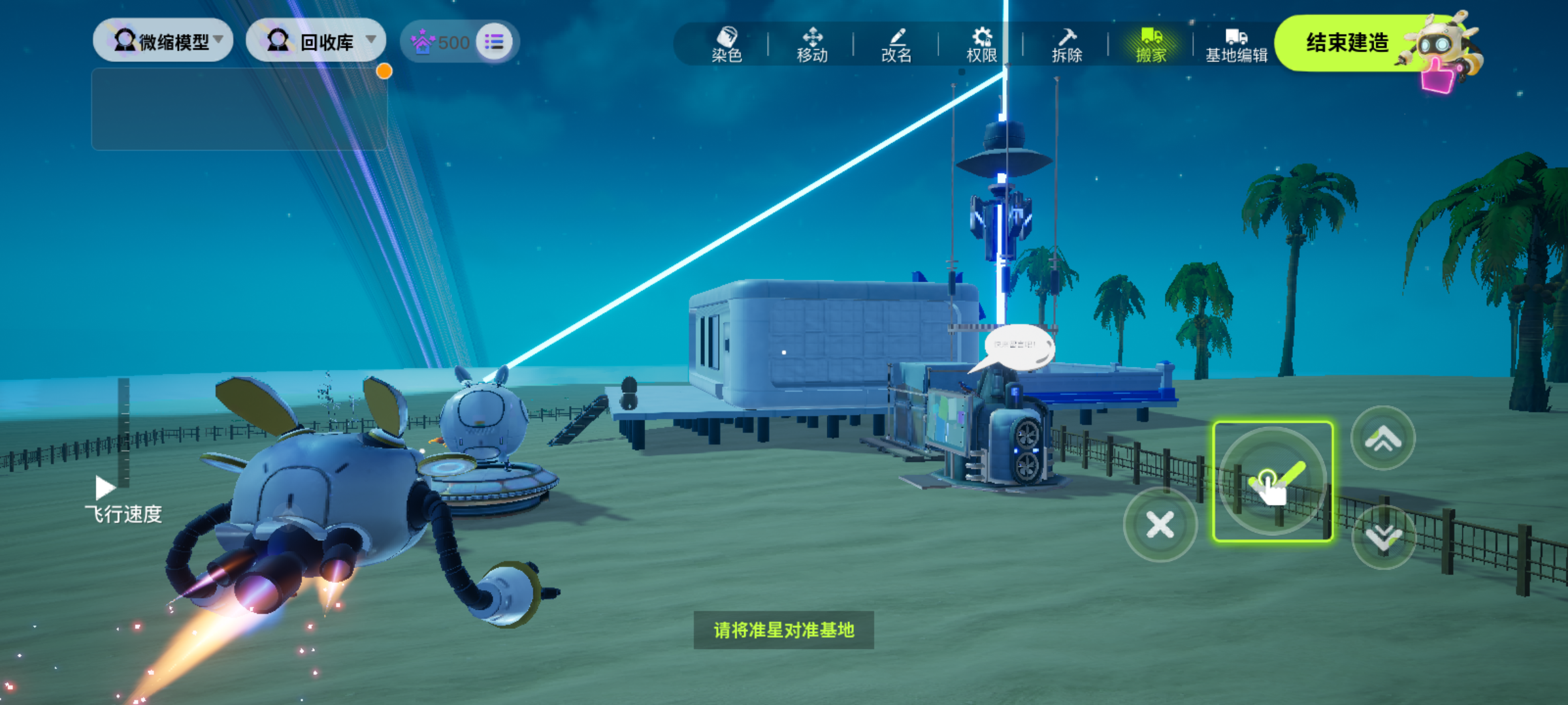 当我们不需要切换星系,只想要前往另一生态安家时可以选择主动搬家,只需要打开建造模式,在界面的右上角选择搬家。并将屏幕中心的准星对准自己的基地就可以将基地回收放入模型,找到合适的地方之后就可以通过模型建造将基地放好。这种搬家方式有90分钟的冷却时间。