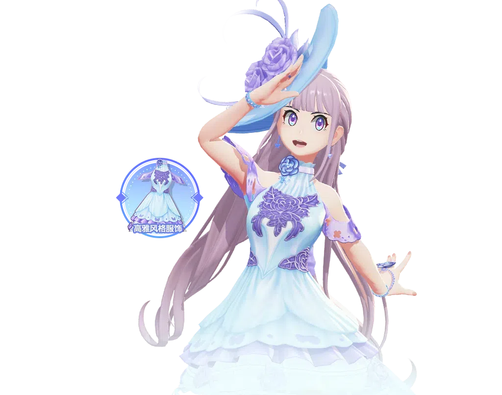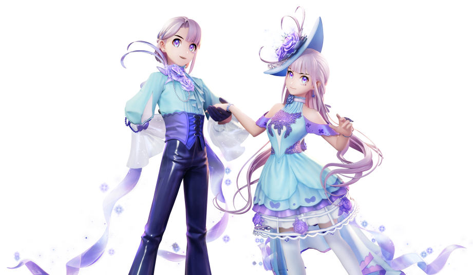 女款为同色系绸缎质地洋装,胸前装饰精致蕾丝绣纹,裙摆紫色花朵点缀其间,配以轻盈的透明尾纱,增添一抹高贵与雅致;飘逸的紫色长发搭配洛可可风格礼帽,和裙装相得益彰,更显温婉与华美。