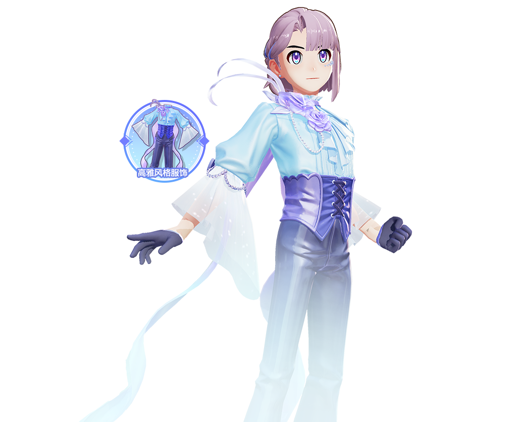 男款为经典复古宫廷礼服风格,延续高雅风格仙子伊布的篮紫配色,短发精心打理,一侧的发束向耳后梳理,彰显干练。缎面上衣剪裁合体,极富层次感,搭配华丽胸章,精致优雅,手套、束腰等颇具设计感的配饰则增添了一份优雅的绅士风度。