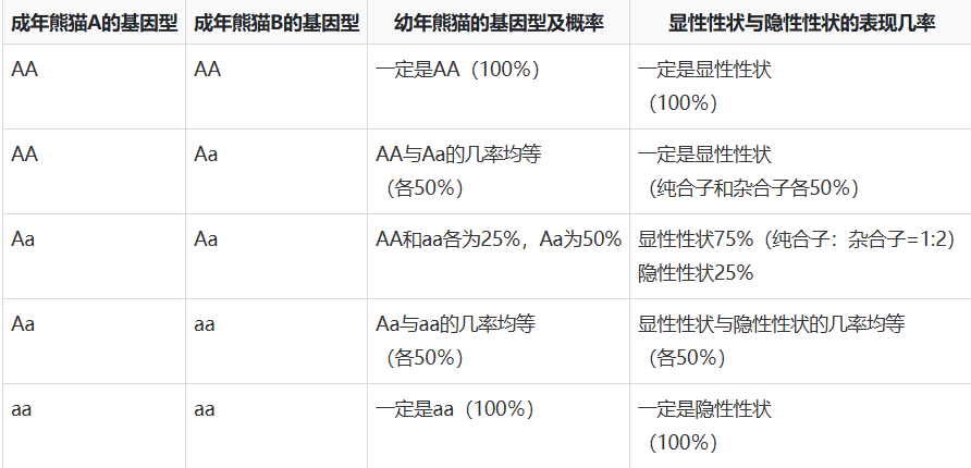所有的熊猫都有2个控制性格的基因。当2个都是显性基因(AA)时,它会表现出显性性状(懒惰、发愁、顽皮、好斗或普通);当1个是显性基因,另1个是隐性基因(Aa)时,它也会表现出显性性状,但携带有隐性基因(体弱 、棕色);当2个都是隐性基因时(aa),则会表现出隐性性状。遗传规则如下表所示。