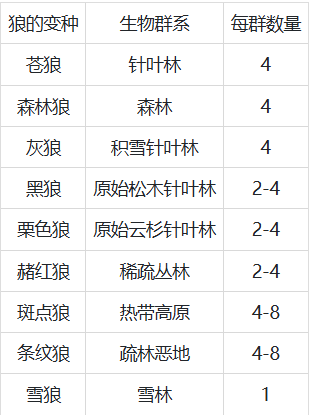 未驯服的狼会在森林、针叶林、原始松木针叶林、原始云杉针叶林、积雪针叶林、雪林及变种生物群系(繁花森林除外)中的草方块、砂土[仅BE]、雪块或雪上生成。[失效:JE 1.20.5和BE 1.20.80]
