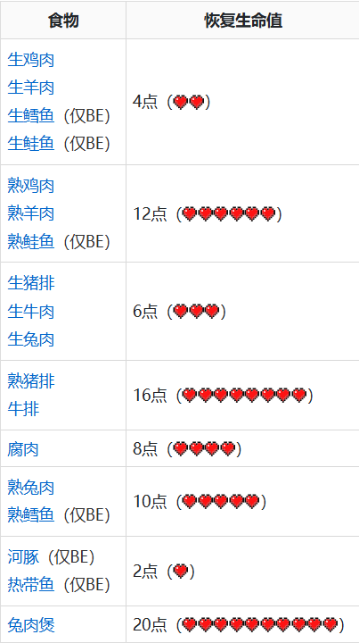 驯服的狼的生命值可以通过喂食肉类来恢复。详见下表。任何肉类给狼恢复的生命值都为给玩家恢复饥饿值的2倍。