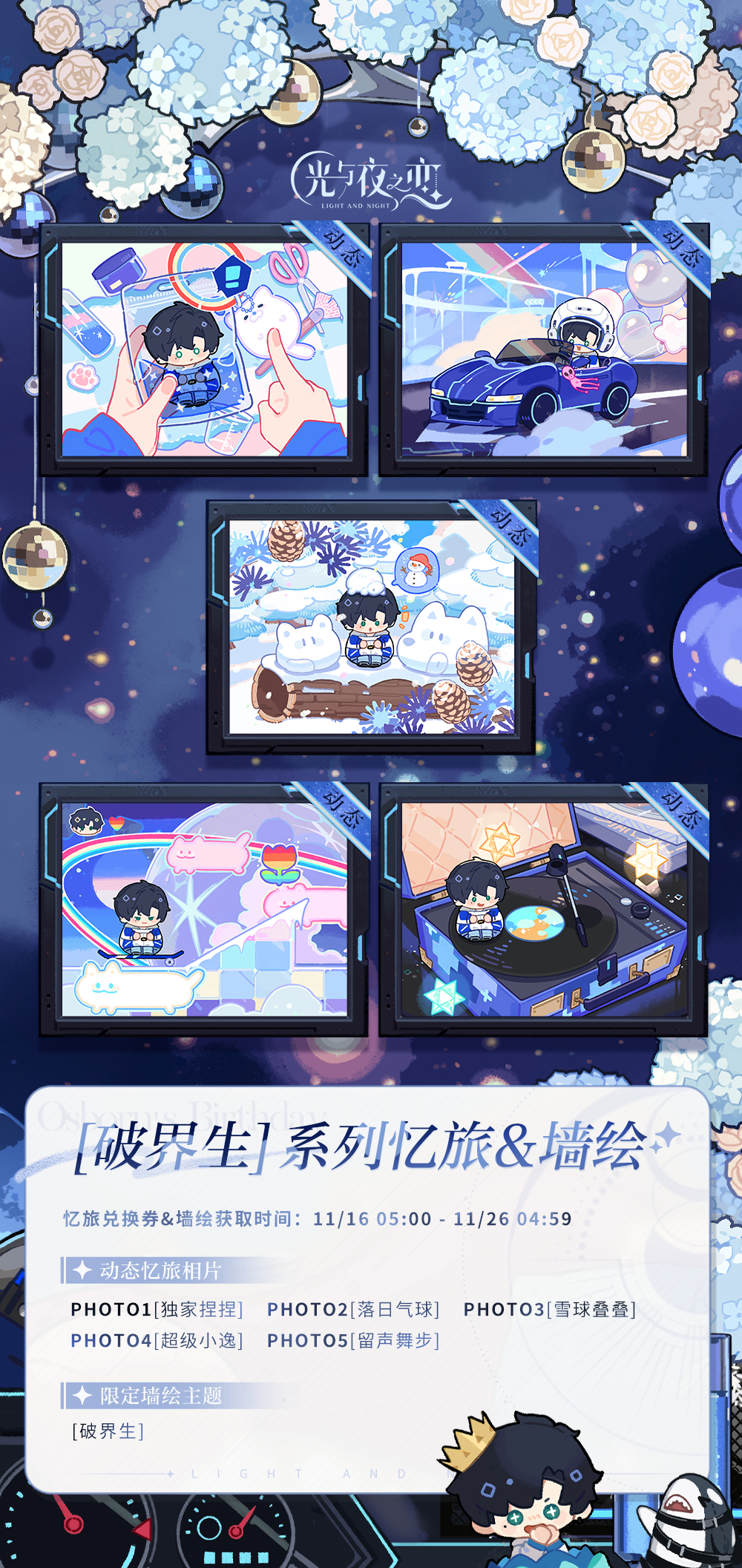 集齐上述萧逸生日系列5张动态忆旅相片后,可在限时计划处领取限定墙绘[破界生]。