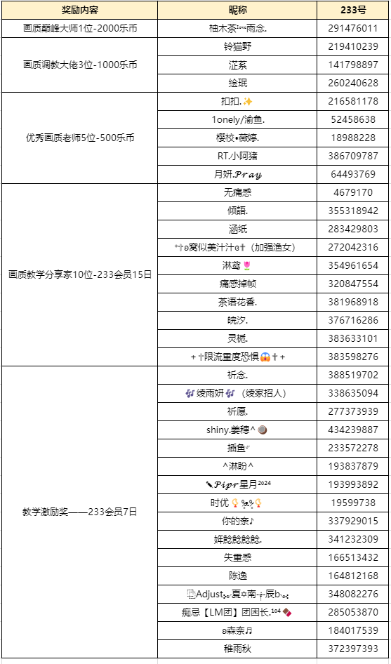 本期樱校画质教学活动已结束,由于本次大家的创作质量太高,官方ggbond特地为所有未上榜但是质量也很高的玩家新增了233会员7日奖励做为鼓励!下面是获奖名单,希望大家再接再厉!