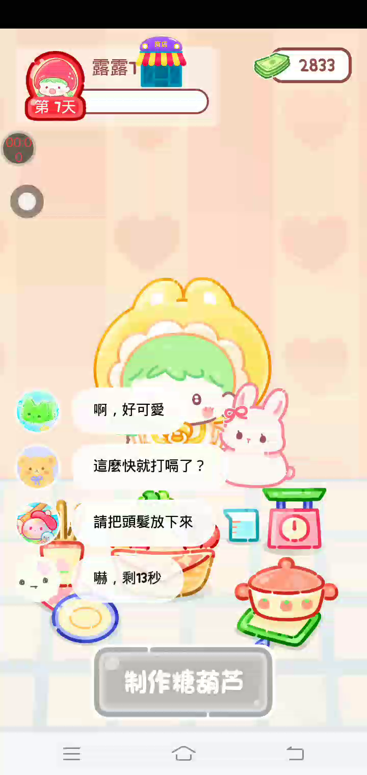 更新宠物!!! 「你进行草莓糖葫芦吃播的话,我就赞助100元。」 「脆口的声音太迷人了(°θ°)」 由于客人都被最近新开的许多糖葫芦店家抢走,曾经号称糖葫芦达人的父母因此卧病在床。 继承父母店面的主角露露开始糖葫芦吃播来宣传店面。 直到成为真正的糖葫芦达人那一天! 「今天我也要开始糖葫芦直播罗!( •o• )」 [串材料] 只有新鲜的水果的话,很难以一名吃播实况主存活下来。还要有松饼、地球软糖、青阳辣椒!利用奇特的材料制作糖葫芦吧。 [裹糖衣] 将材料串满竹签的话,就放进锅子搅动吧。唯有利用达人的秘法,才能裹出又薄又脆的糖衣。 [即时吃播] 咔哒咔哒!今天的吃播也大成功。热烈的聊天内容看起来反应也不错。看来得利用完成观众任务得到的赞助金来买新材料了! 来,准备好了吧?现在就马上挑战成为糖葫芦达人吧!