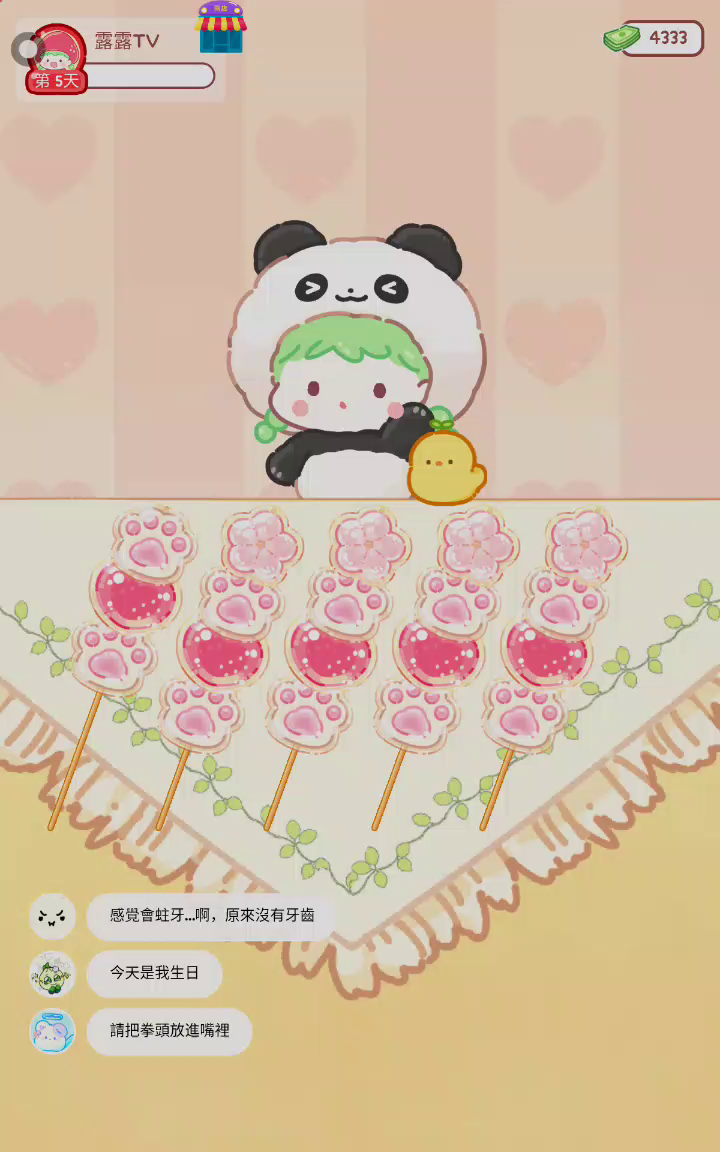 更新宠物!!! 「你进行草莓糖葫芦吃播的话,我就赞助100元。」 「脆口的声音太迷人了(°θ°)」 由于客人都被最近新开的许多糖葫芦店家抢走,曾经号称糖葫芦达人的父母因此卧病在床。 继承父母店面的主角露露开始糖葫芦吃播来宣传店面。 直到成为真正的糖葫芦达人那一天! 「今天我也要开始糖葫芦直播罗!( •o• )」 [串材料] 只有新鲜的水果的话,很难以一名吃播实况主存活下来。还要有松饼、地球软糖、青阳辣椒!利用奇特的材料制作糖葫芦吧。 [裹糖衣] 将材料串满竹签的话,就放进锅子搅动吧。唯有利用达人的秘法,才能裹出又薄又脆的糖衣。 [即时吃播] 咔哒咔哒!今天的吃播也大成功。热烈的聊天内容看起来反应也不错。看来得利用完成观众任务得到的赞助金来买新材料了! 来,准备好了吧?现在就马上挑战成为糖葫芦达人吧!