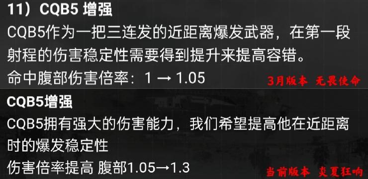 CQB5可能是CODM里增强次数最多的枪械!其中伤害倍率更是连续增强,从1到现在的1.3,也就是说目前版本上半身倍率全部都在1.3倍以上!在当前射速为尊的游戏环境,貌似也可以分一杯羹!