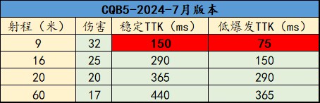 在当前版本中,CQB5有4段射程伤害呈滑梯式衰减!第一段伤害32点,即便打腿1枪,上半身也可以共3枪带走!稳定TTK仅为150ms;如果打头部只需2枪,TTK更是恐怖的75ms,“撕布机”看了都自愧不如!第二段射程,全身稳定4枪倒,TTK为290ms相对比较高但可以薄纱KPS45!第三段射程,降低爆发概率,需要上半身4枪才能带走,之后伤害刮痧伤害不稳定就不再赘述! 因此从面板上来看,这把三连发冲锋枪目前强度很高,即便远距离逊色,也完全可以达到T1,甚至以上的水准!