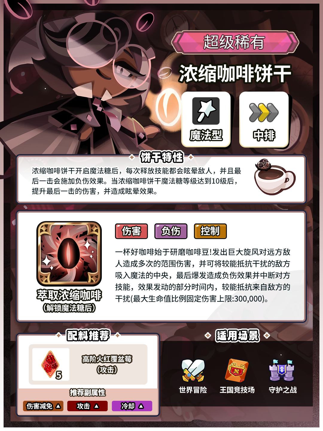 解锁魔法糖后,浓缩咖啡饼干每次释放技能都会眩晕敌人,并且最后一击施加负伤效果。当浓缩咖啡饼干魔法糖等级达到10级后,将提升最后一击当伤害,并造成眩晕效果。