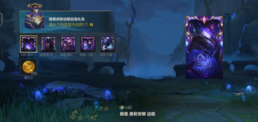 截止至11月28日23:59,暗星皮肤边框自选礼包限时出售!召唤师使用300点券购入礼包,即可从中任选一款喜欢的皮肤边框带走哟,礼包内包含皮肤边框-暗星 奥莉安娜、皮肤边框-暗星尊 烬、皮肤边框-暗星 嘉文四世、皮肤边框-暗星 卡兹克、皮肤边框-暗星 韦鲁斯共5款,还有魄罗币*100好礼可供挑选~