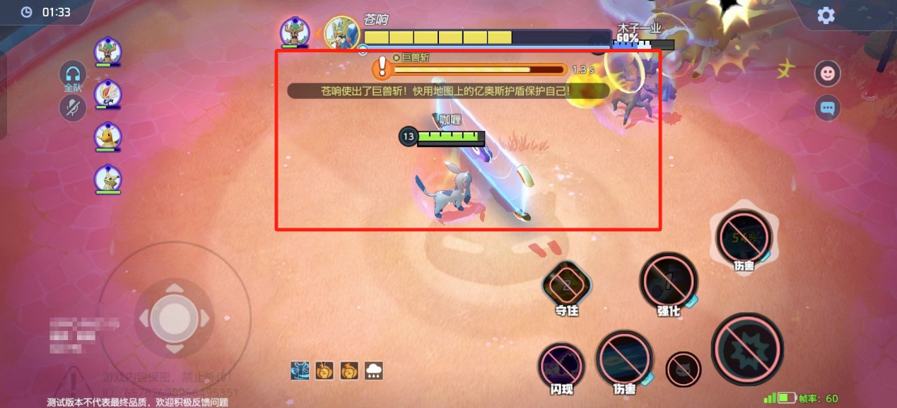 最终头目宝可梦苍响,苍响具有高额的技能伤害,同时技能范围也很广。并且在到达一定时间或者阶段时会释放全屏伤害技能巨兽斩!此时需要训练家们利用地图中央的亿奥斯护盾保护自己及时躲避伤害,避免团灭导致时间不够出现挑战失败的情况发生。