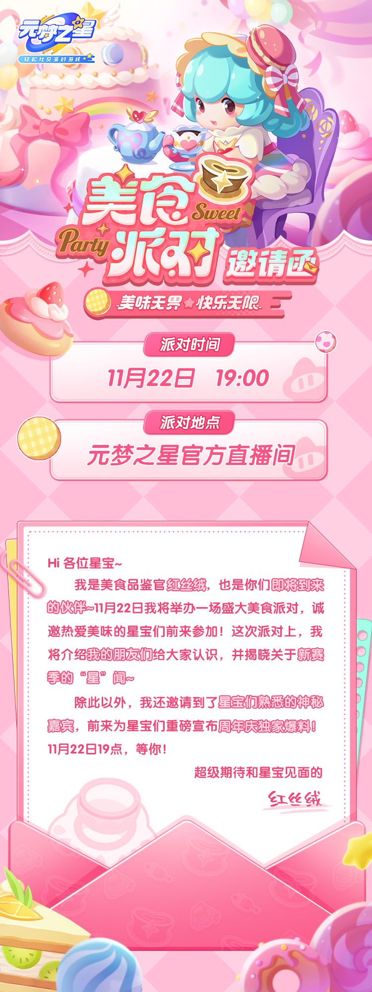 “美味无界,快乐无限!”全新赛季【美食派对】即将开启美食品鉴官红丝绒,为大家准备了一场盛大的派对,不仅有星朋友亮相为大家重磅宣布新赛季内容,还有神秘嘉宾带来周年庆独家“星”闻爆料哦!我们元梦将会有哪些玩法变化呢?星宝们记得锁定元梦之星官方直播间11月22日 19:00,我们不见不散!