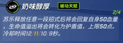 苏乐释放任意一段招式后将会回复自身50血量,生命值溢出将会转化为护盾值,上限50点。冷却时间12/11/10/9秒。