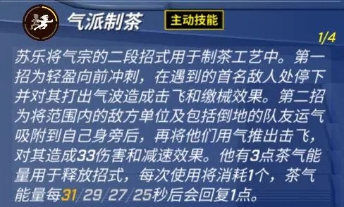 苏乐对敌人造成眩晕后将会回复自身的茶气能量,敌人每人每次受到眩晕后,将会回复单个茶气25%/30%/35%/40%的能量。