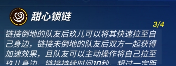 首先我们来看玖儿的主动技能一甜心链一甜心锁链连接倒地的队友后,玖儿可以将其快速拉至自己的身边;甜心锁链连接未倒地的队友后双方一起获得加速效果,而且队友可以主动操作将自己拉至玖儿身边,甜心锁链持续时间10秒。各位玩家要注意了,超过一定的距离,将会断开锁链,冷却时间为35/30/25/20秒,该技能是可以连套把队友救来的