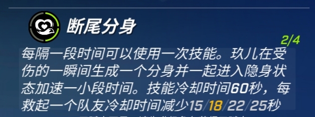 最后我们再来看玖儿的被动技能一一断尾分身一一每隔一段时间可以使用一次技能。玖儿在受伤的瞬间生成一个分身并一起进入隐身状态加速一小段时间,技能冷却时间60秒,每救起一个队友冷却时间减少15/18/22/25秒
