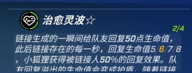 接下来我们看玖儿的被动技能治愈灵波☆甜心锁链生成的一瞬间给队友恢复50点生命值,此后甜心锁链存在的每一秒,回复生命值5/6/7/8,玖儿获得被甜心锁链连接的人50%的回复效果。队友回复溢出的生命值会变成护盾,随着甜心锁链一起消失,如果生命值是满血的将会转化成护盾,给我们的队友。