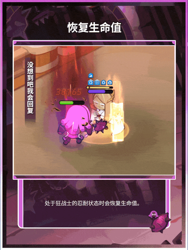 紫薯饼干开启魔法糖后,在进入战斗时会获得「狂战士的愤怒」增益效果,该效果叠加到一定程度时,紫薯饼干会转换为「狂战士的忍耐」在短时间内恢复一定的生命值。