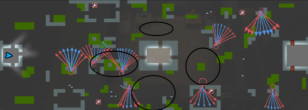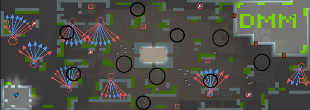 下图黑色圆圈区域分别为4V1模式&8V2模式逃生补给箱生成的固定区域,有些生成地点会进入到窗口附近,因此追捕使用聚合弓可进行偷袭;另外逃生者也可在黑色区域中释放跟踪雷进行埋伏敌方,游玩老六打法。