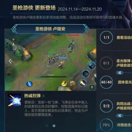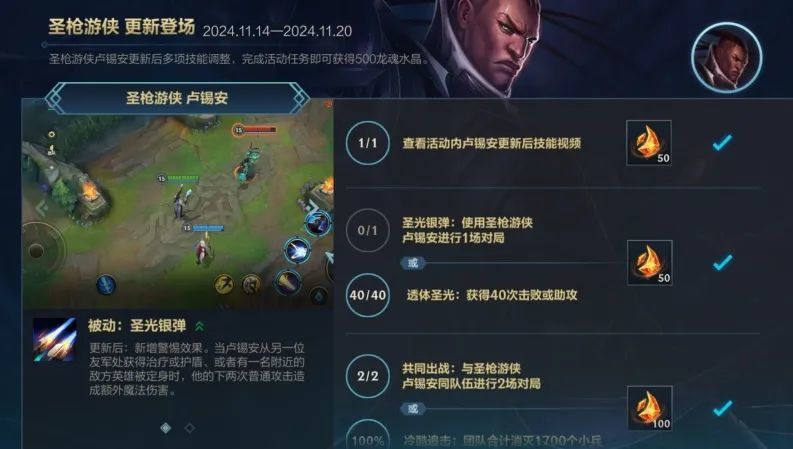 圣枪游侠 卢锡安重做归来领好礼仅剩最后1天!截止至11月20日(今日)23:59,召唤师完成任务即可获得龙魂水晶*500好礼~