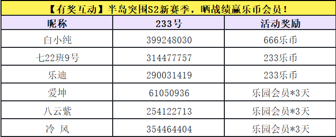 🏅随机抽取3名玩家送出233乐币
