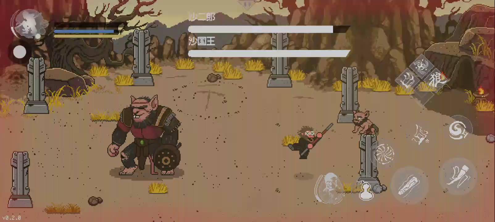 《黑神话像素版》已更新第二章节,第二章节0.2版本与0.1版本存档不互通,更新至0.2新版本后,进入游戏点击【新的轮回】即可游玩第二章节全新内容。 第二章(0.2版本)更新内容 1、新增第二章节:风起黄昏; 2、新增boss:广智、沙国王、沙二郎、浪里个波、波里个浪、虎先锋等; 3、新增隐身、变身、分身等技能法术; 4、新增神力系统和蓄力条; 5、新增精魄系统; ----------- 温馨提示: 本游戏是由B站UP主:火山哥哥开发制作的同人游戏,233乐园对该游戏进行收录供大家游玩体验。 下载使用产生的版权问题请自行负责,233乐园不承担任何法律责任,如果您喜欢该游戏请支持官方正版。233乐园不拥有任何权利,其版权归该游戏的合法拥有者。如果该游戏侵犯了您的版权,请将相关版权证明或授权证明发送到邮箱,我们将在24小时内删除该游戏。 《黑神话悟空》像素版来袭啦!火山哥哥化身像素大师,将经典场景还原得淋漓尽致,十个不同地图场景让你眼花缭乱。孙悟空的移动、跳跃、战斗系统全部上线,连蓄力劈棍、棍花闪避都超级流畅,简直是像素版战斗艺术!小狼妖、大头、金池长老等BOSS悉数登场,每个都有独特招式,让你体验不一样的战斗乐趣!更有喝酒功能、定身术、存档系统等丰富玩法,让游戏不再单调。