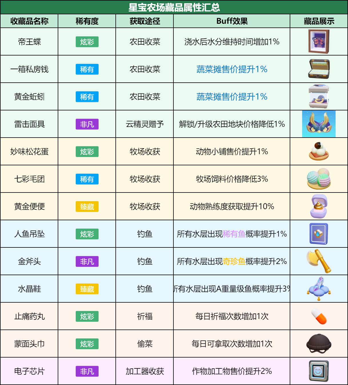 最后,也是星宝们最关心的部分,就是珍贵的藏品们究竟有哪些实际作用呢?贴心的星妹已经将这些藏品的稀有度获取途径buff类型统统整理在下表啦!方便懒人星宝直接查看,大家也可以在农场中藏品-图鉴里进行查阅。
