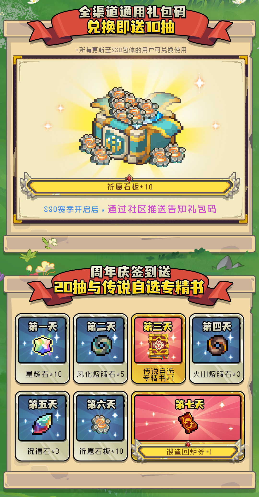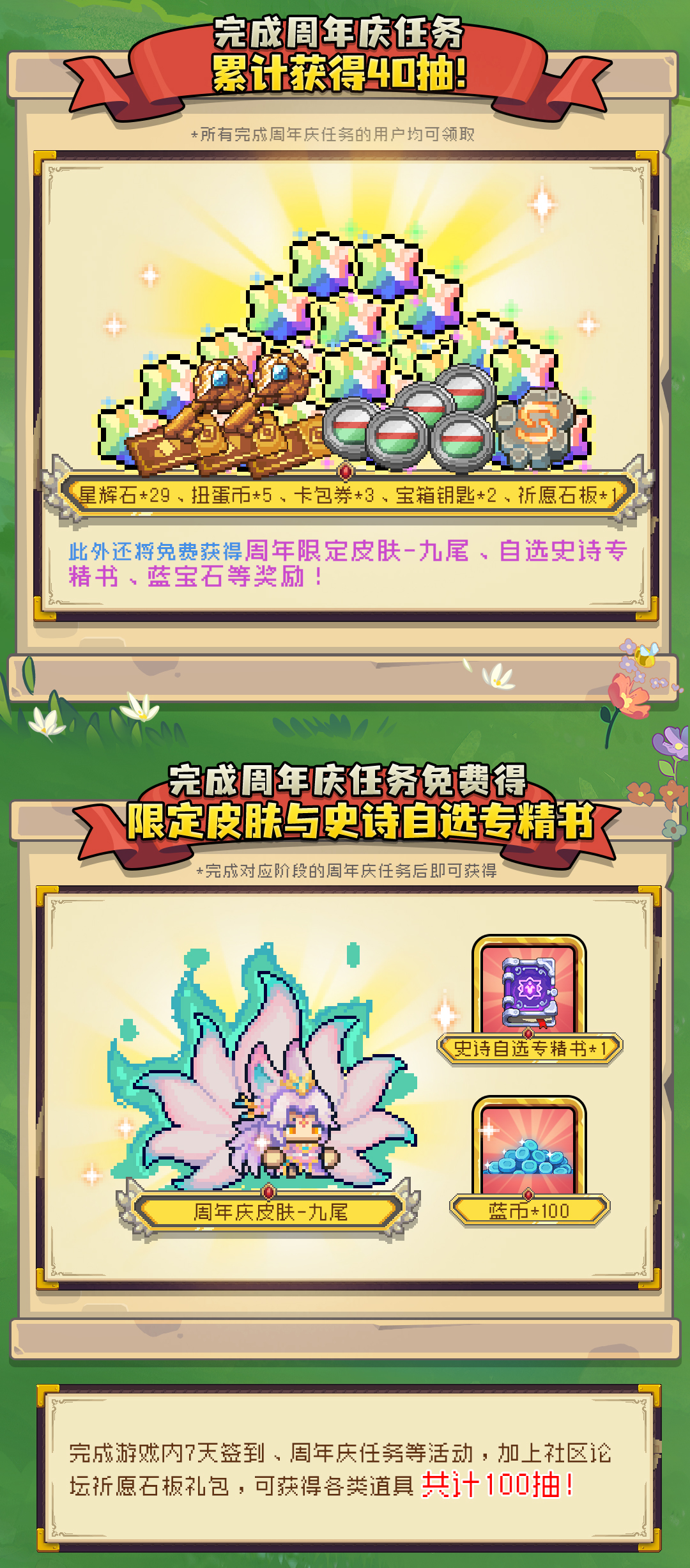 累计100抽、周年限定皮肤、传说自选专精书、大量游戏道具等奖励免费送