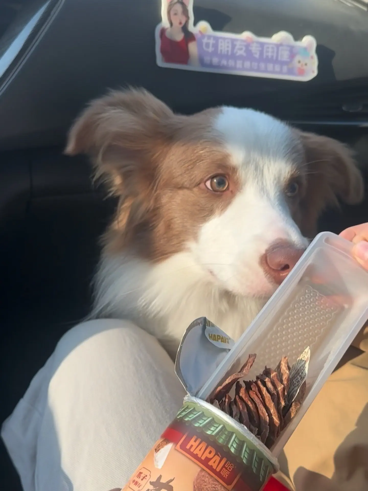 这是一则边牧吃播内容,画面里边牧正在户外进食,博主发起提问,征集下期平价的狗狗食物选题。