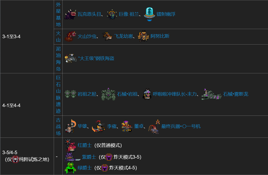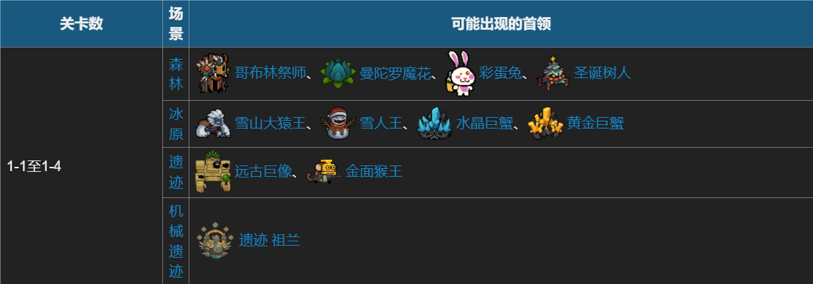 每小关中生成的首领不会重复。比如玩家在3-1小关中击败 巨像 祖兰并进入下一小关后,随后的小关将不会再次出现该首领。