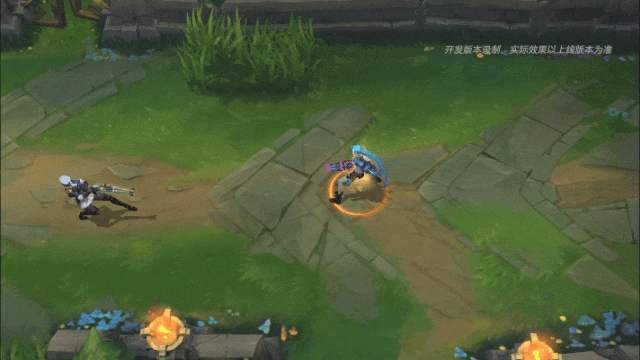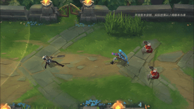 如果敌人被绳网命中,将触发拥有双倍射程的精准狙击,凯特琳与敌人之间出现淡蓝色的三角形指引线,敌人脚下出现橙色光圈,身后出现蓝色刻印瞄准器标识,子弹出膛,对敌人造成一定的伤害。