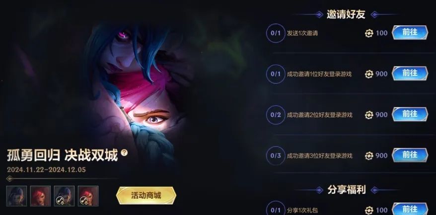 即日起,截止至12月5日,召唤师完成活动任务获取双城币,即可兑换双城之战 金克丝皮肤、双城之战 蔚皮肤、专属回城音乐《孤勇者》、皮肤姿态等好礼~